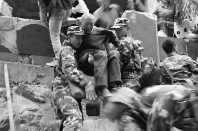 沒有受傷的普通群眾,很多也主動留下來參加搜救工作。沒有專業(yè)的救援工具,就用鐵鏟、鐵鍬,有人干脆從廢墟中揀起鋼筋加入營救。沒有擔架,就用門板抬起傷員,越過幾公里坍塌的山路,轉(zhuǎn)移到鄰近的城鎮(zhèn)進行救治。