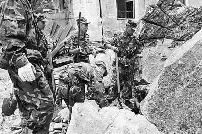 當天凌晨,解放軍某部的2000余名官兵,一進入綿陽市北川縣城,就開始了緊張的救災(zāi)工作。