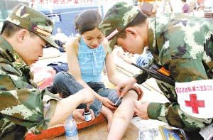 15日16時,廣東邊防六支隊醫(yī)療小分隊得知有4名被困學生急需救助后迅速趕往救援地點。有4名學生正通過亂石中的一條縫隙向外呼救,此時距離他們被困已超過75小時。被困4名學生被一一救出。廣東邊防六支隊官兵立即將他們抬上擔架送往戰(zhàn)地醫(yī)院救治。15日晚上,在地震發(fā)生80小時內(nèi),廣東邊防六支隊醫(yī)療小分隊在漢旺鎮(zhèn)東汽中學的廢墟中成功救出4名被困中學生。