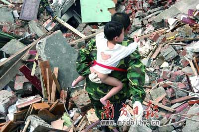 昨日下午5點(diǎn),記者第三次深入北川縣城核心現(xiàn)場(chǎng),發(fā)現(xiàn)一股從背后深山逃出的人流。他們的眼神充滿對(duì)親人的依戀,生怕再次分開。11歲的張吉萬背著3歲半的妹妹張韓,非常吃力地走著。同行的爺爺、奶奶已經(jīng)老了,父母在外打工,小吉萬就勇敢地?fù)?dān)負(fù)起小男子漢的責(zé)任。早上5點(diǎn)出發(fā),已經(jīng)走了12個(gè)小時(shí)了。小吉萬說,他很愛妹妹。