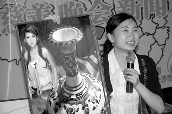 晚會(huì)導(dǎo)演郭翼向大家介紹李湘將在晚會(huì)現(xiàn)場拍賣的青花瓷。陳飛 攝