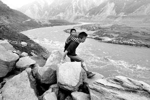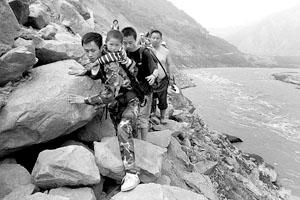 走了大半天,前方的路被新落下的大石擋住,如果要過去,記者必須雙手扒著石頭,側身挪過。但這樣,孩子便會被置于半空,萬一孩子手一松,瞬間就會跌入大江。