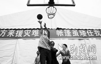 籃球場還有一個籃球架和五分之一個場地空著。傍晚7時,14歲的北川縣漩坪中學初一學生張俊林,和幾個伙伴一起打起籃球。他說,他的家毀了,但沒有人受傷,他現在一家5個人與其他三家人一起住在一個大帳篷里,他現在最盼望的是快點回到真正的教室上課。(特派記者 韋忠南 張泉 陳世昌)