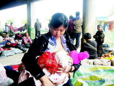 北川縣陳家壩鄉(xiāng)太紅村7組村民楊金玉的丈夫被埋在了廢墟中,由于傷心過度,楊金玉斷了奶,只有兩個(gè)月大的兒子便再也沒有吃上奶。北川縣陳家壩鄉(xiāng)平溝村二組村民劉蓉的女兒陳星星剛滿5個(gè)月。劉蓉由于受到地震驚嚇,奶水嚴(yán)重不足。還有母親受重傷、僅3個(gè)月大的嬰兒母瑤瑤……