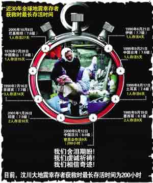 湖南的醫(yī)療隊(duì)介紹,7時許,老太太被抬上救護(hù)車緊急送往彭州醫(yī)院。從12日下午被埋開始到被解救的196小時,老太太沒有吃任何東西,只是間歇地喝了點(diǎn)雨水。醫(yī)生介紹,老太太神志比較清晰,已被送到成都華西醫(yī)院治療。