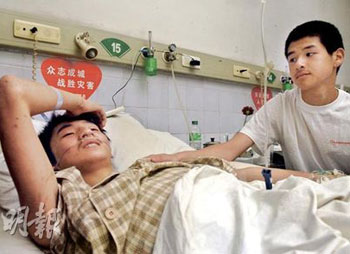 不過,醫(yī)院工作人員表示,廖波的傷口有感染征狀,可能需要再動手術(shù),他也經(jīng)常做噩夢而驚醒,一次次回到地震當(dāng)天的情景,想起遇難的同學(xué)就會流淚。見此情況,李陽想多陪廖波幾天,在醫(yī)院亦有北川中學(xué)的老師,答應(yīng)照顧李陽的衣食住行,并會在他復(fù)課前帶他返校。