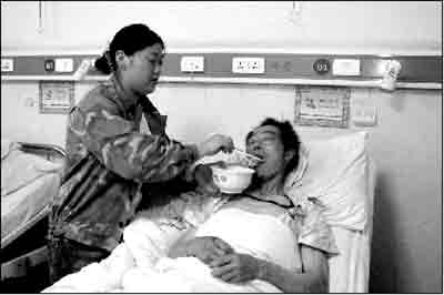 昨天是陳仁平在綿陽第三醫(yī)院的最后一晚,胃口極好的他晚餐吃了3個餃子。在北川陳家壩的山中被埋后,56歲的陳仁平靠著兩個雞蛋硬撐了169個小時,經(jīng)過診斷,他的盆骨骨折。
