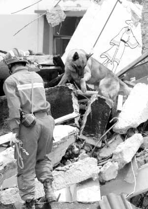 “行動(dòng)”,賈樹志一聲令下,四只“戰(zhàn)神”立即沖向廢墟堆里,在訓(xùn)導(dǎo)員的牽引下,不停地來(lái)回穿梭,只要有空隙的地方,它都會(huì)伸長(zhǎng)了脖子往里嗅。半個(gè)小時(shí)之內(nèi),四只搜救犬圍著廢墟整整轉(zhuǎn)了兩個(gè)來(lái)回之后,便耷拉著腦袋從廢墟上下來(lái),一副失望的神情。
