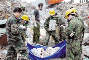 在長達6天的搜救過程中,北川縣日益成為危城。官兵們將資金、食品急送至鄰近的謝家坪村,那里有36戶受災(zāi)群眾;18日,他們將大量群眾轉(zhuǎn)移至安全地帶……同時,他們冒著余震不斷、堰塞湖隨時可能決堤的危險晝夜作業(yè),先后3次緊急修改搜救方案,共救出9名幸存者,并于21日傍晚成功挖出金庫庫款。官兵們將廢墟中散碎的人民幣逐一收撿入兩個大袋子,5個存放大量現(xiàn)金的保險柜也被逐一發(fā)掘出來——18時20分,第一批資金被清點出來;19時20分,搜救工作結(jié)束,北川信用聯(lián)社620余萬元資金完好無損(如圖)!官兵們繼續(xù)搜尋,包括記錄資金信息的筆記本電腦、憑證等均被搶救出來。
