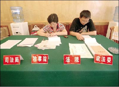 國土局是大廳最受人矚目的角落,因?yàn)槟莾翰粌H有一臺電腦,還有唯一的一臺傳真機(jī),這些是綿陽市國土局專門送來的。工作人員尹艷說,她也只能用電腦打一些報表,因?yàn)闆]有公章,只能在上面簽名。