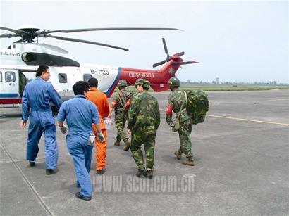 得到前線救援人員通過海事衛(wèi)星報(bào)告的消息后,德陽抗震救災(zāi)指揮部心急如焚,人的生命高于一切!由于楊家溝濃霧彌漫,27日下午,救援直升機(jī)冒著危險(xiǎn),在距地面10米的空中展開搜索!翱,下面有人影!”飛機(jī)盤旋了很久,但因當(dāng)?shù)赜幸慌琶芗母邏壕,飛機(jī)無法降落,眼看大霧越來越濃,救援直升機(jī)只得返回廣漢機(jī)場待命。