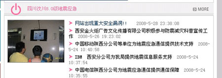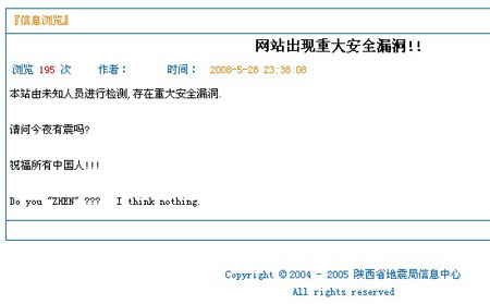 28日23時(shí)38分,記者正常登錄到陜西省地震局網(wǎng)站(陜西省地震信息網(wǎng))時(shí),在該網(wǎng)站首頁“四川汶川8.0級(jí)地震應(yīng)急”欄目中發(fā)現(xiàn)一條題為“網(wǎng)站出現(xiàn)重大安全漏洞”的信息,點(diǎn)擊進(jìn)入后內(nèi)容顯示“本站由未知人員進(jìn)行檢測(cè),存在重大安全漏洞”,并隨后附有三條“網(wǎng)友留言” 。