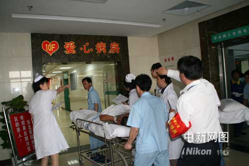 記者坐上載著傷員救護車,警車開道一路綠燈直達救治的醫(yī)院,在車上傷員家屬告訴記者:到處都是我們的親人,一路上大家都很受照顧,已經(jīng)感受到家庭的溫暖。下午四時許,駛進蘇北醫(yī)院,為了迎接傷員,醫(yī)院早就開始了準備,在住院十病區(qū)開辟了 “愛心病區(qū)”。王靜成院長稱,這是我們醫(yī)院最好的病房,醫(yī)院為四十名災(zāi)區(qū)傷員親人配備了經(jīng)驗豐富的醫(yī)護人員,確保醫(yī)療安全,盡量降低致殘率,讓他們安心治病、早日康復(fù)。