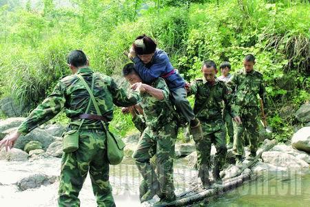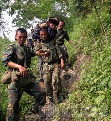 一大早,我們160人每人背著40公斤給養(yǎng)、物資、器材開(kāi)始翻越這座大山。政委說(shuō),茶坪老百姓需要我們。在翻越一個(gè)峭壁時(shí),列兵侯軍腳下一滑摔倒了,旁邊就懸崖,慶幸的是,除背囊隨著山石滾下山崖,侯軍本人安全地爬了起來(lái)。九個(gè)小時(shí)后,我們終于到達(dá)茶坪鄉(xiāng)。茶坪鄉(xiāng)副鄉(xiāng)長(zhǎng)張平一見(jiàn)到我們,就撲通一聲跪在了參謀長(zhǎng)面前說(shuō):“人民子弟兵來(lái)了,茶坪就有希望了……”參謀長(zhǎng)一把將他扶起,兩個(gè)漢子都淚流滿面。
