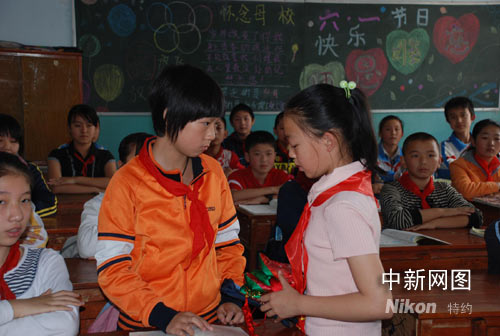 中新網(wǎng)吉林6月5日電(蒼雁)四川什邡地震災(zāi)區(qū)的女孩廖涵來吉林市投奔親屬,豐滿區(qū)英語實(shí)驗(yàn)小學(xué)免費(fèi)安置其入學(xué)。端午節(jié)前夕,吉林市另一所學(xué)校的一名12歲女孩帶著全班64名學(xué)生的心愿前去探望廖涵,并送去祝福荷包。