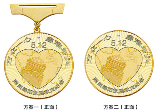 趙琛說,紀(jì)念章有著特殊的表現(xiàn)形式。內(nèi)輪廓為心型,代表全國人民萬眾一心支持綿陽賑災(zāi);外輪廓為圓形,象征太陽。整個紀(jì)念章的正面寓意為“心中太陽升起”,表達四川綿陽人民重建家園的信心和力量。