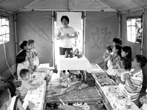 成為最牛帳篷小學(xué)的校長,非常偶然。來自北京的幾名志愿者觸動了我。19日,哀悼日第一天,我路過受災(zāi)群眾安置點(diǎn),看到有人正擠在帳篷里給孩子們上課。我就找機(jī)會和他們聊天,這時我才發(fā)現(xiàn),他們來自北京的幾所高校,有教授,有博士后,差不多都是高級知識分子。我對他們馬上產(chǎn)生了一種敬意。