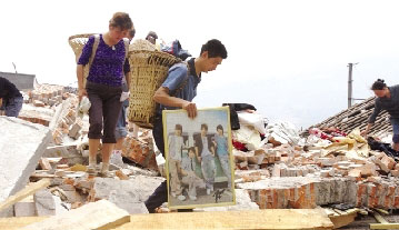 受災群眾從廢墟中撿拾自己的東西,準備重建家園。夏永 攝