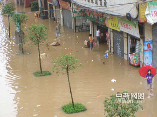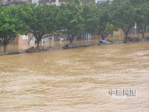 從今晨開始,流經韶關市區(qū)的湞江和武水(均為廣東北江支流)均已漫過河堤,淹浸部分街市。記者看到,位于市區(qū)風度路步行街南端的中山公園已是一片汪洋,園前西路亦成澤國,有人以小船代步,或用小艇裝運雜物。而在火車站附近的某大型超市,記者則看到購買大米、蔬菜、速食面、瓶裝水等物品的顧客明顯比往日多,但商場內這些物品貨源充足,貨架不斷空架,又不斷補足充滿。