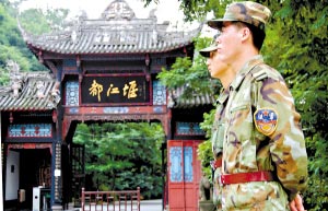 兩千多年前,秦蜀郡守李冰父子修建了雄偉的水利工程都江堰,使之成為巴蜀大地上偉大的防洪和灌溉工程,四川也因此成為富饒豐厚的“天府之國(guó)”。然而,5·12大地震不僅讓都江堰市區(qū)受損嚴(yán)重,世界文化遺產(chǎn)青城山-都江堰也在地震中遭到了不同程度的損壞。日前,在都江堰市街頭,舉目看去,絕大多數(shù)受損樓宇中皆人去樓空,而幽甲天下的青城山和澤被天府的都江堰景區(qū)也已暫時(shí)封門謝客,景區(qū)內(nèi)除了巡邏的解放軍戰(zhàn)士和救災(zāi)帳篷,已經(jīng)看不見(jiàn)一個(gè)游人。都江堰大壩旁的一條游客通道上,活動(dòng)板房建設(shè)工人正在緊張施工,曾經(jīng)游人如織的景區(qū)道路上,靜靜豎起一大排藍(lán)白相間的板房。