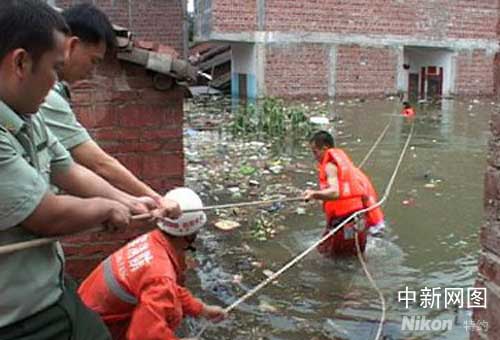 消防支隊立即調(diào)派人員趕赴現(xiàn)場營救,F(xiàn)場附近許多瓦房都已被泡在水里,只露出屋檐,一些來不及處理的垃圾和木棍橫七豎八地浮在水面上。據(jù)附近的村民介紹,這里一帶的水位有三至五米深,中間還有一條較寬的水溝,而被洪水圍困的人員就在岸對面約50米遠的一棟三層樓高的民房內(nèi),已經(jīng)有四天時間了。