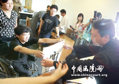今天上午,吳華林坐著輪椅在其妻子的陪同下來到一中院聽候宣判,法官宣布判決結(jié)果,要求全體起立時,坐在輪椅上的吳華林用雙手撐住輪椅的扶手身子挺了起來。聽到宣判結(jié)果,吳華林臉上露出了滿意的笑容。他拿出自己寫的“愛”字和“謝謝”的條幅贈送給法官,表達自己的感謝之情。