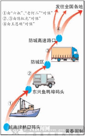 為進(jìn)一步降低風(fēng)險(xiǎn),陳虹光也如法炮制,將從越南碼頭到防城倉庫一段,“對!苯o東興人“六叔”、“老何二”(另案處理)。