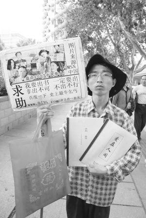 手舉一個“要飯”的牌子和兩本書稿,口袋里裝著一把自制的名片。昨日上午,在漢口中山公園大門附近,一位被網(wǎng)友稱為“史上最牛乞丐”的男子現(xiàn)身街頭,圍觀群眾對其行為褒貶不一。