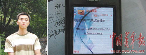 葉與陳同村。2007年3月20日始,他的手機(jī)收到一條短信。“你有一條留言需要接收,請(qǐng)發(fā)短信a到××××收取!泵τ诠ぷ鞯娜~直到3個(gè)月后才看到了這條奇怪的短信。葉以為是朋友的留言,可拇指按下去后得到的是一條垃圾短信,同時(shí)被告知話費(fèi)少了8.1元。