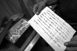 兩人離開后約10分鐘,與老人同行的小伙又回來,將一個塑料袋遞給賀德志后離開!按永镉幸粋鞋盒,我打開來看都是錢,還有一封信!辟R德志說,當他追出店外,已不見小伙。