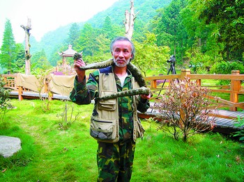 至今,他的左手中指只剩下最下面一節(jié),那是2003年一條莽山烙鐵頭蛇送給他的“禮物”。當年8月,陳遠輝將人工孵化的莽山烙鐵頭蛇拿到“鬼王寨” 放生。一條蛇在身體接觸地面后,突然轉(zhuǎn)過頭來,狠狠地咬住了陳遠輝的左手中指。為了拍攝到蛇咬人的珍貴鏡頭,陳遠輝竟用右手拿著DV拍了近5分鐘才將蛇甩開。(特派記者 劉軍)