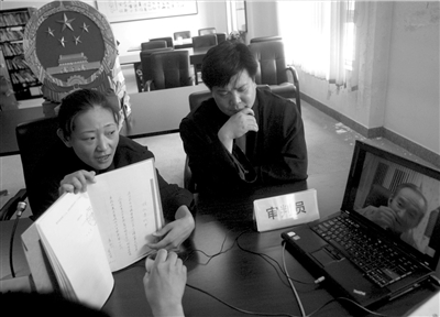 法官通過(guò)攝像頭向遠(yuǎn)在美國(guó)的焦老漢展示材料。 本報(bào)記者王儉攝