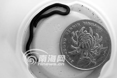 海南萬寧后安鎮(zhèn)何先生18日早晨9點(diǎn)在自家后院抓到一條只有一根牙簽大小的類似蛇的生物(右圖),何先生對照本報曾經(jīng)報道過的重慶發(fā)現(xiàn)“世界最小的蛇”的文章后稱,他發(fā)現(xiàn)的生物才是真正的“世界最小”。小生物通體黑色,長約6厘米。何先生告訴記者,他小時候也曾經(jīng)見到過這種生物,在海南鄉(xiāng)村、墻角、衛(wèi)生間等潮濕的地方就會碰到這種小生物。但具體這是哪種生物,學(xué)名怎么稱呼,到底有沒有毒,何先生稱不甚了解。(南國都市報 記者李域攝影報道)
