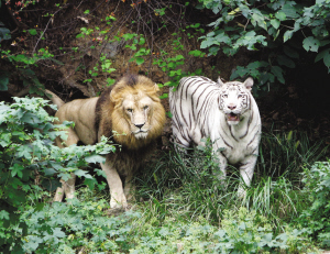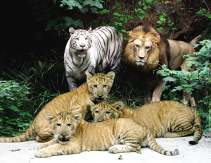 據(jù)了解,獅虎獸的父母是一只雄性非洲獅和雌性孟加拉白虎“小雪”,都是2002年在紅山動(dòng)物園出生的,一起生活在“獅虎生態(tài)園”,感情很好。當(dāng)初跟它們一起關(guān)進(jìn)園里的還有另外五只猛獸,包括兩只母獅,一公一母兩只虎,以及一只母白虎?墒沁@只雄性非洲獅就是喜歡跟“小雪”待在一起,對(duì)自己的同類——兩只母非洲獅反倒不理不睬。后來(lái),工作人員先后移出了兩獅兩虎,園里只留下“小雪”、雄性非洲獅,和一只母東北虎。園子里“太平”了,“小雪”跟它的獅“哥”更是形影不離,親密不已,那只母東北虎成了“電燈泡”。