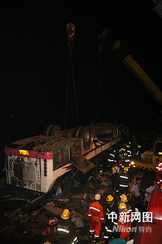 事故現(xiàn)場(chǎng),救援人員用吊車將已經(jīng)完全倒翻的大客車托起。