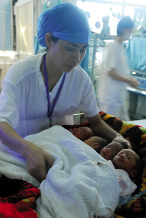 盡管孩子的父親失蹤,孩子們?cè)卺t(yī)院得到很好的照顧。記者采訪時(shí)看到四胞胎躺在嬰兒溫箱里睡得很香。醫(yī)務(wù)人員告訴記者,四胞胎屬于早產(chǎn)兒,住院前四胞胎中的男嬰肺部出了點(diǎn)問題,吸過幾天氧,現(xiàn)在情況已基本穩(wěn)定,另外三名女嬰的健康狀況都比較好。