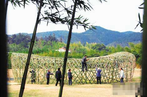 杭州雙溪景區(qū)的村民仿照奧運鳥巢的造型,用了800根竹子,10多個人經(jīng)過15天的手工編制,以20比1的比例制作出“竹鳥巢”,并將它作為當?shù)剜l(xiāng)村運動會的會場,開展沙灘排球、弓箭狩獵、滾鐵圈等項目。(7月29日《天府早報》)