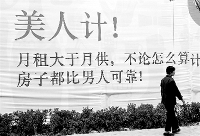根據(jù)何先生所提供的線索,記者在河醫(yī)立交橋向西約1000米的棉紡東路上,看到了這則面朝南的巨幅房產(chǎn)廣告。白色布景的廣告墻上赫然寫著那句讓何先生不爽的廣告。該廣告美其名曰“美人計(jì)”,是為“粉領(lǐng)公寓”做的廣告,從廣告語來看,其目標(biāo)消費(fèi)群是女性。