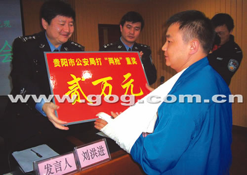 4月28日,貴陽市公安局召開“打擊‘兩搶一盜’犯罪、偵破命案”有獎舉報獎勵兌現(xiàn)新聞發(fā)布會,包括協(xié)助特警擒獲嫌疑人的的哥鄭宏等37名見義勇為的市民受到獎勵,警方為這37名市民兌現(xiàn)獎金共計(jì)157000元。