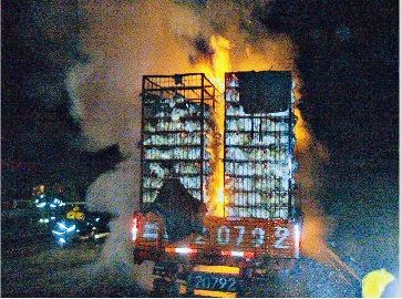 接到報警后,陽泉消防特勤中隊和平定消防中隊的20多名消防人員迅速趕赴現(xiàn)場,發(fā)現(xiàn)該車由于后部輪胎起火,車廂后半截已被濃煙包圍,受到驚嚇和炙烤的烏雞亂作一團,撲騰亂叫。消防人員立即展開行動,很快,貨車車廂內(nèi)的明火被撲滅。由于該車運送的烏雞太多,空間非常密集,車廂內(nèi)部的一些明火不能順利撲滅,消防人員迅速用兩支水槍從貨車上部往下打水,使水慢慢浸入到車廂內(nèi)部。隨后,消防人員用開花水槍對部分被引燃的烏雞進行噴淋滅火。