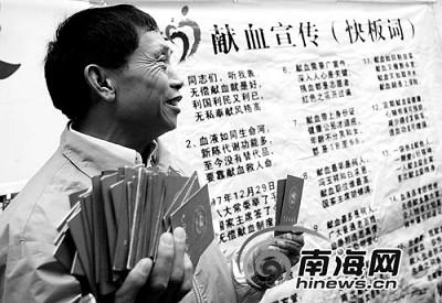 “我健康我獻(xiàn)血,你捐血你快樂,救人生命積功德……”在海口明珠廣場,省血液中心采血車旁,穿著樸素的楊順德,操著四川口音、拿著半導(dǎo)體喇叭重復(fù)地向人們宣傳獻(xiàn)血的好處和獻(xiàn)血知識。