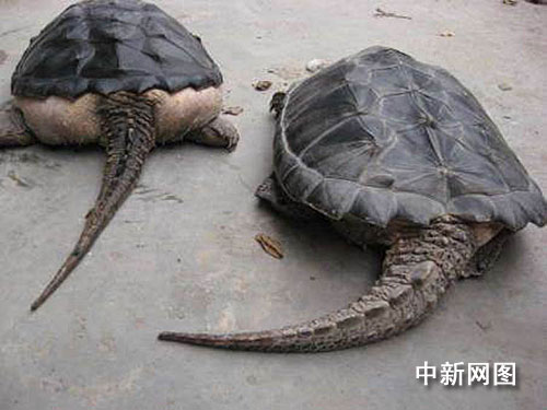 于先生把兩件“寶物”拿到室外讓我們觀賞。由于時(shí)下已是冬季,它們正處于半冬眠狀態(tài),趴在地上慢慢蠕動,對圍觀的群眾投以好奇的目光。個(gè)頭較大的那只,不停張嘴覬覦著四周。經(jīng)仔細(xì)觀察,其長相集龜和鱷魚于一體,尤其是粗壯的尾巴,與鱷魚的尾巴無疑。體長一尺有余,背殼直徑二十多厘米,上有三條凸起的三角形棱脊,并有放射狀斑紋。頭部較粗大,不能完全縮人殼內(nèi),脖短長有褐色肉刺,尾巴尖而長,長有肉突刺,爪子尖而有力。