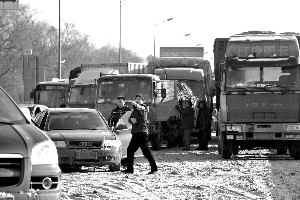 昨日下午1時,八達(dá)嶺高速路水屯出口處,出京方向,大貨車排成約20公里的長龍,前后看不到盡頭。由于長時間沒有挪動,一些司機或下車探路或在車上睡覺。交警介紹,目前水屯路口積雪清理完畢,車輛今日可完全疏散。據(jù)了解,累計數(shù)千輛大貨車因雪被困在此兩日夜。