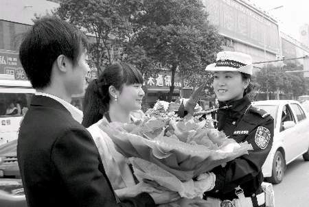 昨日早上9時(shí)許,新郎宋貴權(quán)和新娘陳芳就抱著一束鮮花,來到綿陽交警直屬一大隊(duì),找他們的“護(hù)嫁天使”。一位交警告訴他們,吳莎可能在嶺南崗?fù)?zhí)勤。宋貴權(quán)和陳芳又抱著鮮花趕到嶺南崗?fù)ぃ锩娌]有人,一名在路口執(zhí)勤的交警告訴他們,吳莎要10點(diǎn)鐘才來。宋貴權(quán)和陳芳就抱著鮮花在嶺南崗?fù)さ却?/p>