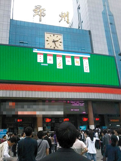 5月16日,鄭州火車站本該顯示車站公告的戶外超大顯示屏上,卻出現(xiàn)了紙牌游戲(見圖),共耗時20來分鐘,游戲過關(guān)后,綠色屏幕上煙花襯著“你贏了”三字。鄭州火車站表示當(dāng)時打牌的人不是火車站的工作人員,是施工方的。據(jù)瀟湘晨報報道,昨晚,河南本地一公司宣稱對此事負(fù)責(zé)并致歉。