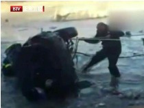 轎車側(cè)滑墜入冰河 百人喊號(hào)子合力救援