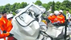 【解說(shuō)】接到報(bào)警后,當(dāng)?shù)叵啦块T立即趕往現(xiàn)場(chǎng)救援。現(xiàn)場(chǎng)只見一輛大貨車側(cè)翻在馬路旁,地上布滿了一層厚厚的水泥粉,路旁的樹木被撞倒了許多,車廂內(nèi)水泥已經(jīng)基本散落到路旁的山坡下,貨車車頭在猛烈撞擊后變形嚴(yán)重,一男子被困駕駛室內(nèi)。