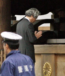 | 10月17日,日相小泉無視亞洲各國的強(qiáng)烈反對再次參拜供奉有二戰(zhàn)日本甲級戰(zhàn)犯的靖國神社。對此,中國外交部發(fā)表聲明,嚴(yán)厲譴責(zé)小泉“拜鬼”。中國駐日本大使王毅也在東京緊急約見日本外相町村信孝,向日方提出強(qiáng)烈抗議。 |