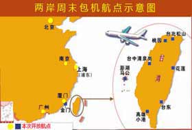 航點 大陸方面同意先行開放北京、上海(浦東)、廣州、廈門、南京5個航點,并陸續(xù)開放成都、重慶、杭州、大連、桂林、深圳,以及其他有市場需求的航點。臺灣方面同意開放桃園、高雄小港、臺中清泉崗、臺北松山、澎湖馬公、花蓮、金門、臺東等8個航點。