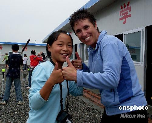 圖:美國職業(yè)女壘隊(duì)在綿竹鼓勵(lì)災(zāi)區(qū)學(xué)生